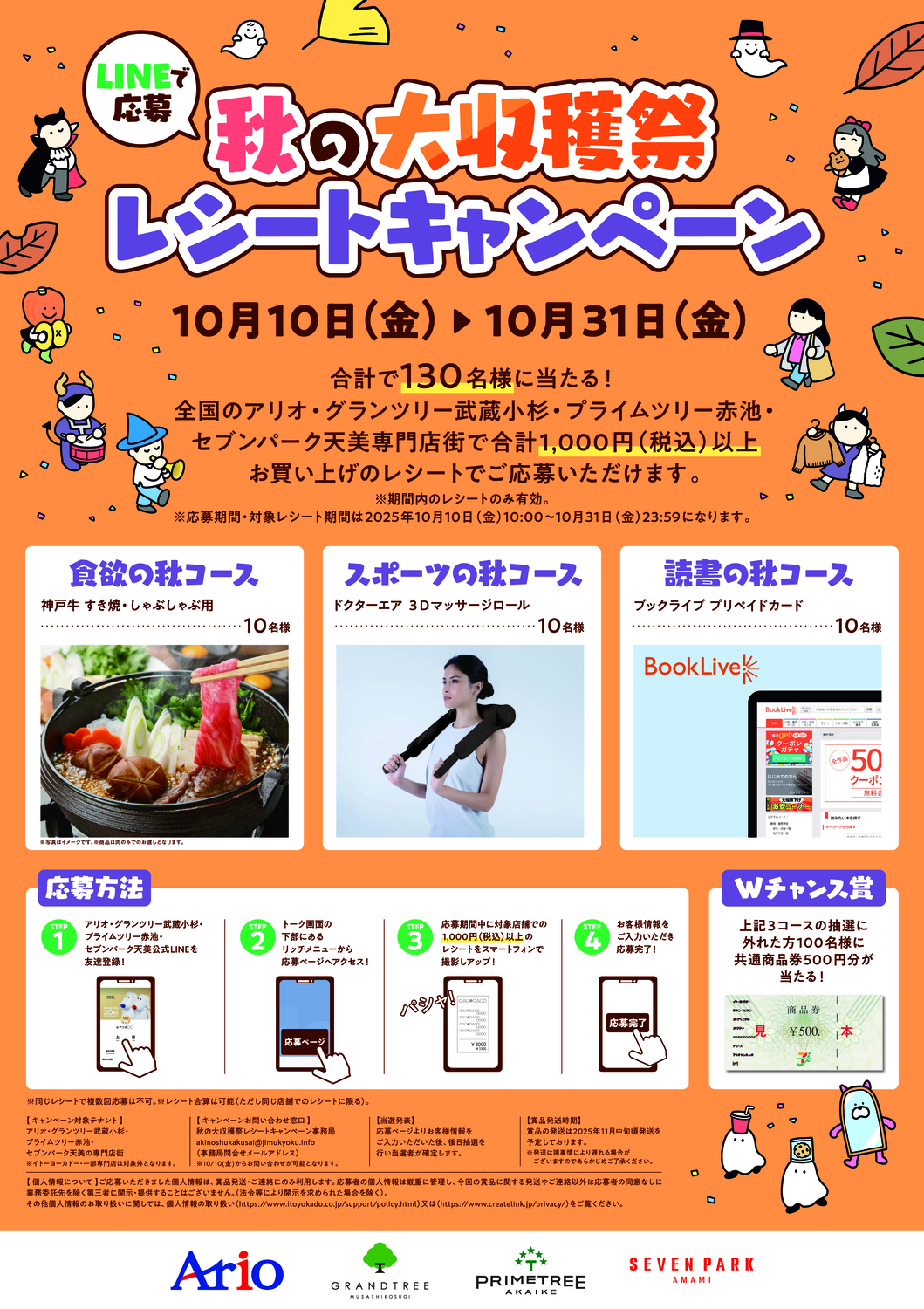 全国のアリオ・グランツリー武蔵小杉・プライムツリー赤池・セブンパーク天美専門店街で合計1,000円(税込)以上お買い上げのレシートでご応募いただけます。