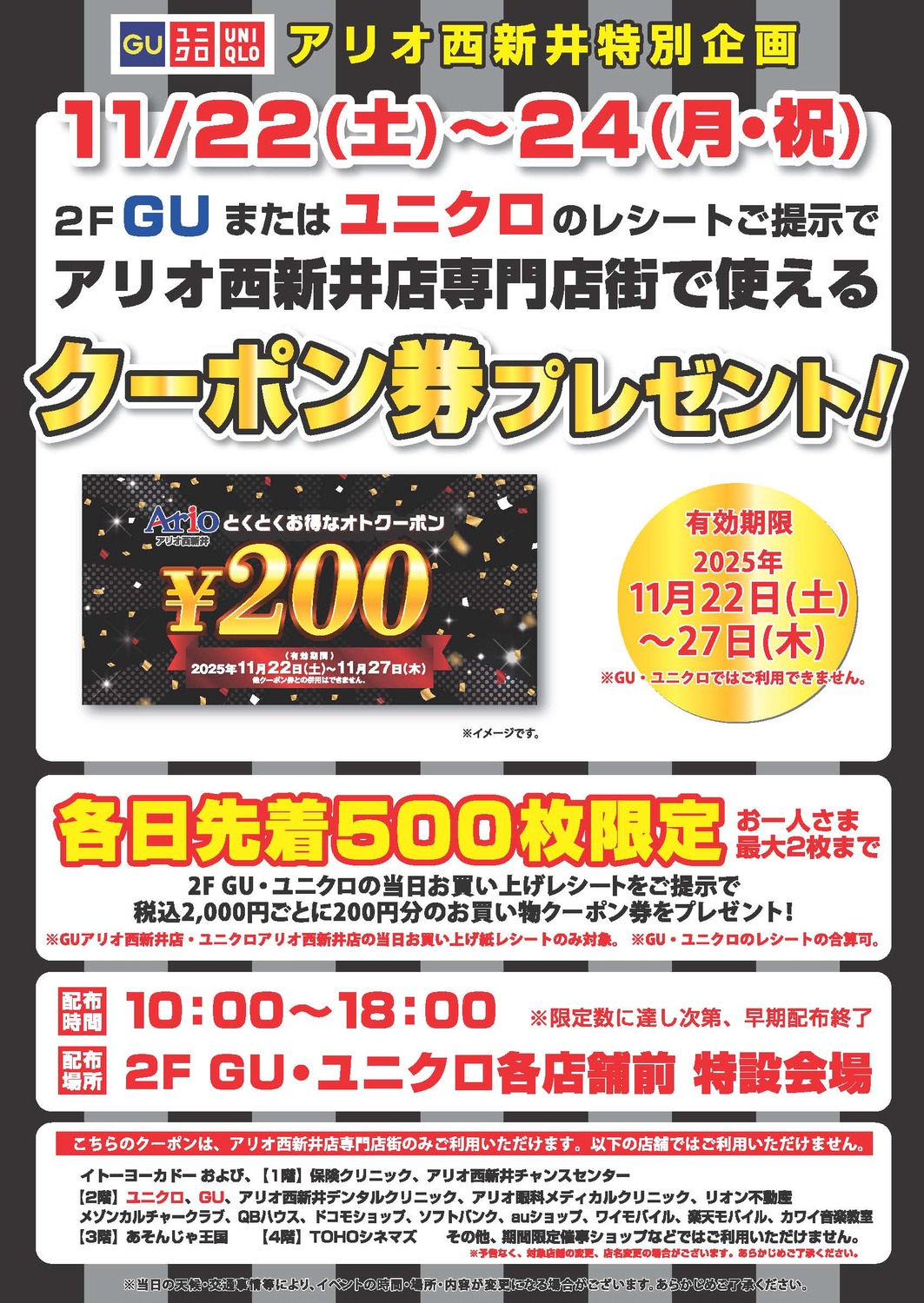 ※GUアリオ西新井店、ユニクロアリオ西新井店の当日お買い上げ紙レシートのみ対象。