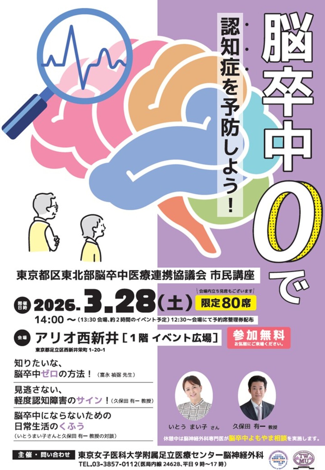問い合わせ先: 東京女子医科大学附属足立医療センター脳神経外科医局 TEL 03-3857-0112(内線番号 24628、平日9時-17時)