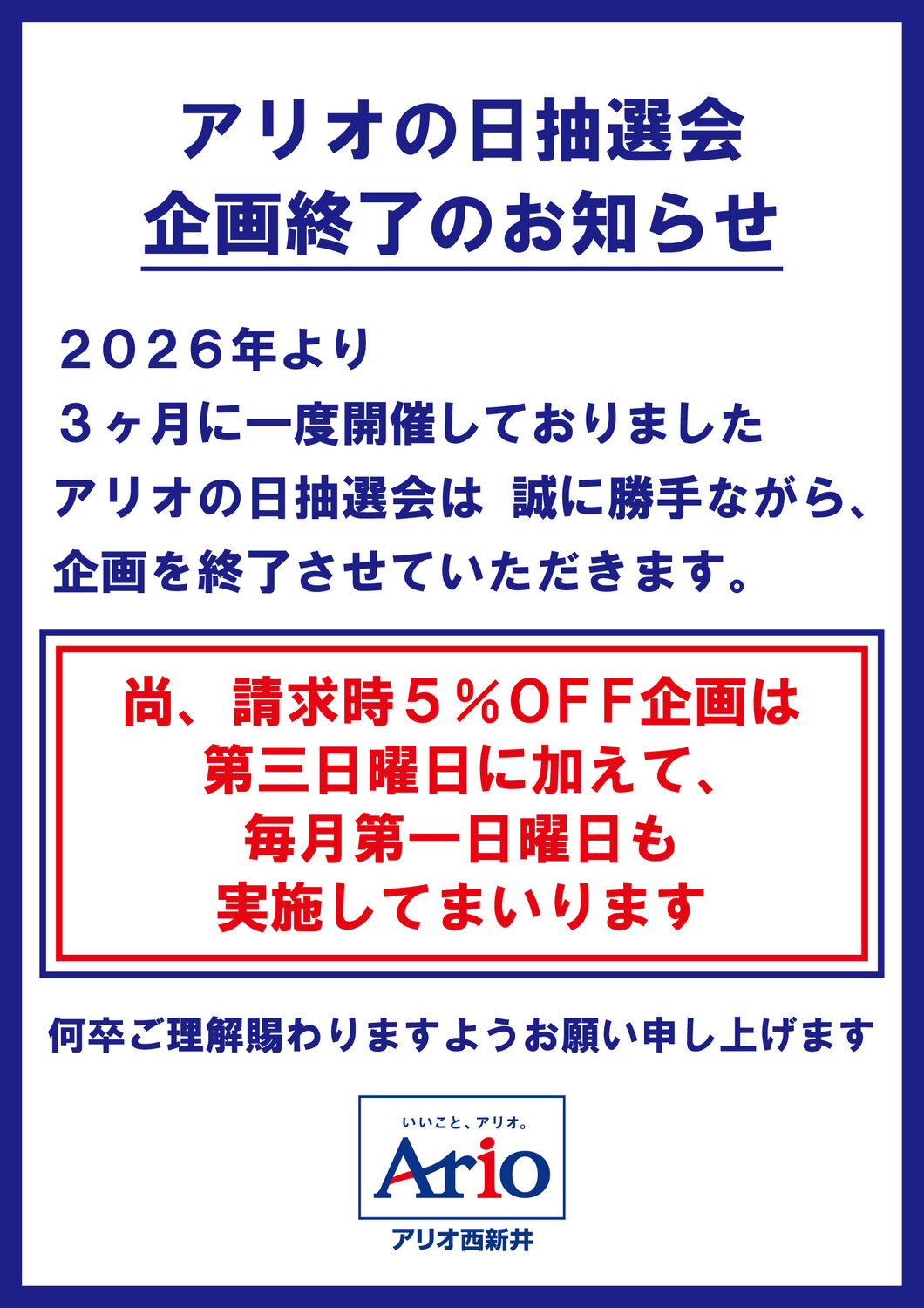 アリオの日抽選会 企画終了のお知らせ