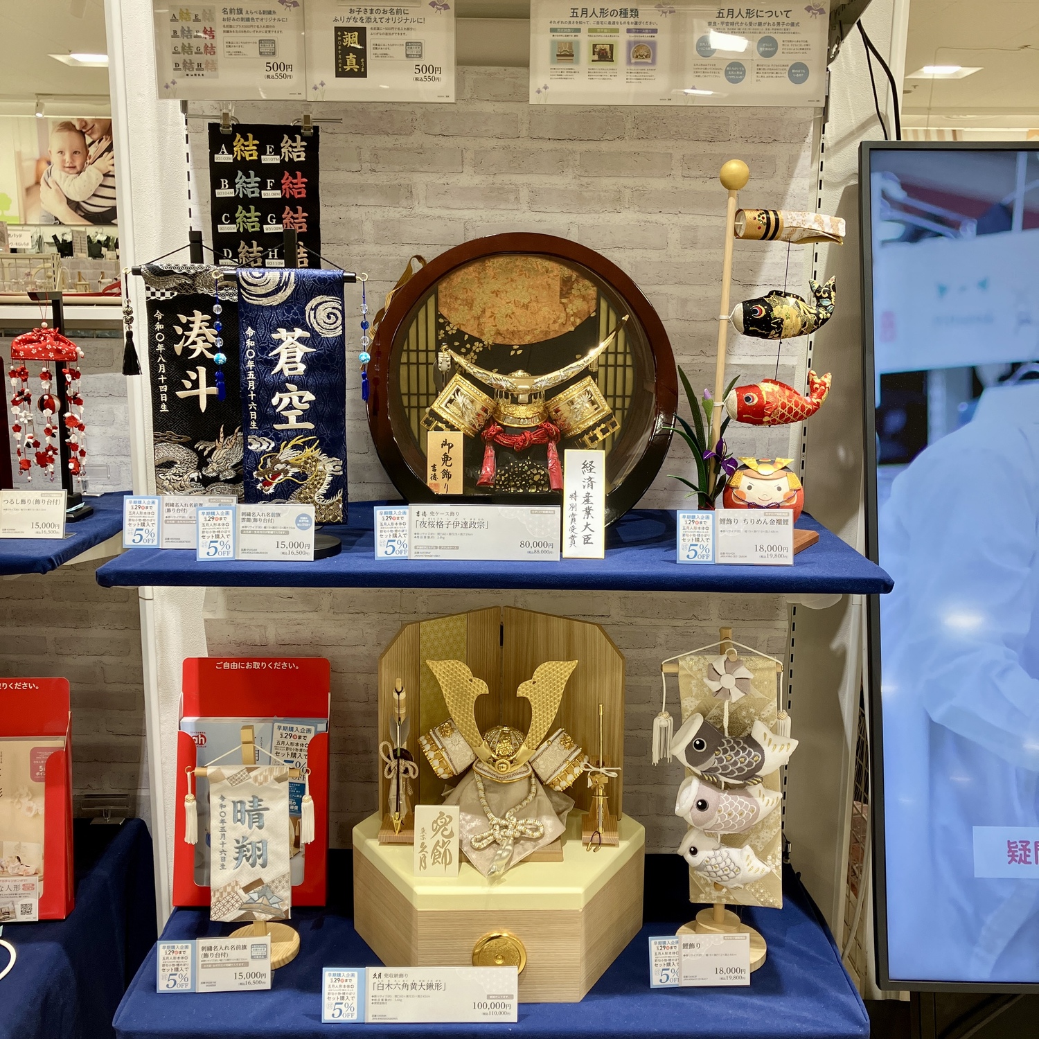 アカチャンホンポでは五月人形(兜)の展示を一部展示スタート致しました。今後今現在ひな人形を展示しているエリアに順次展示を拡大して参ります。