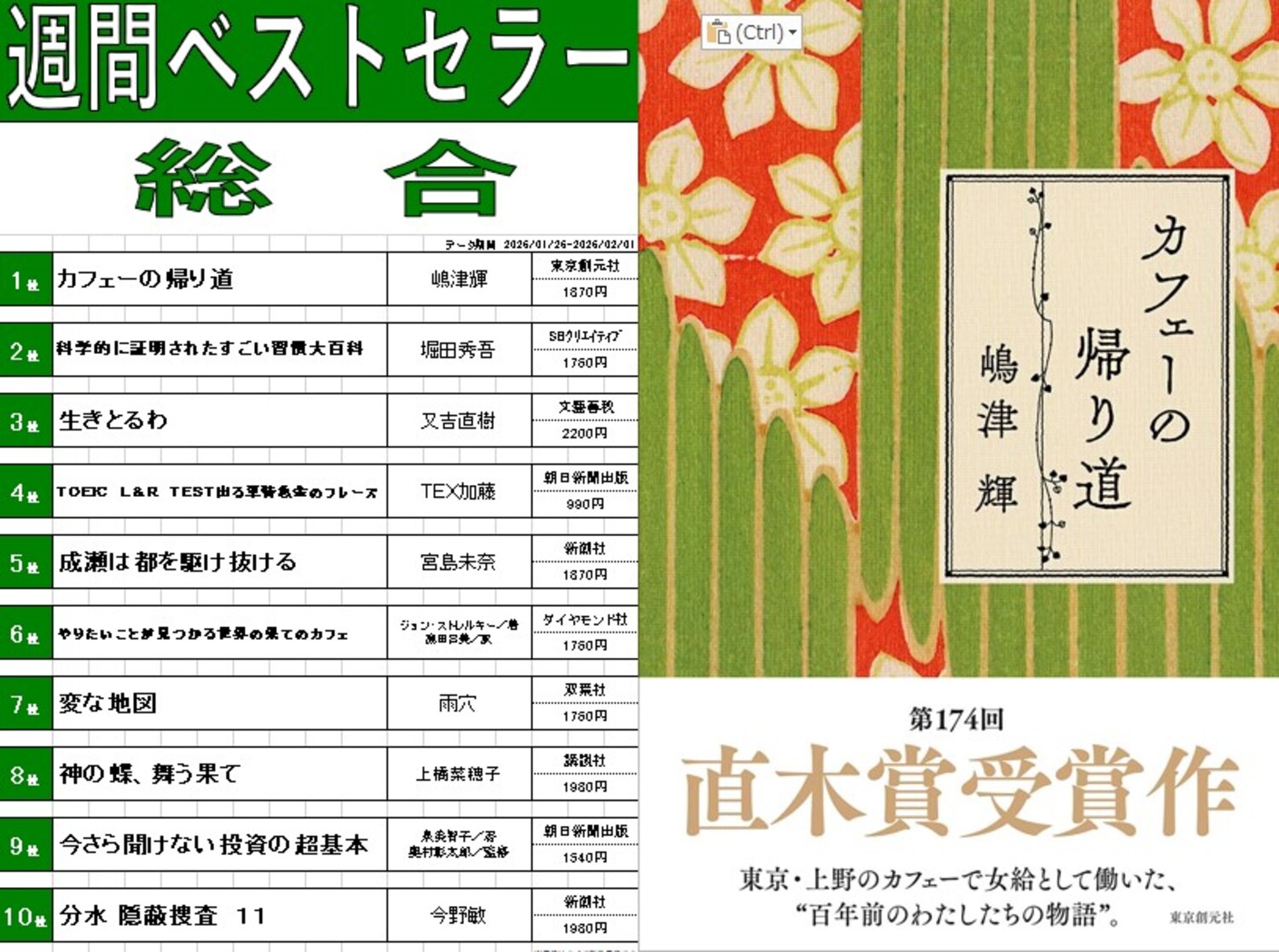 今週のベスト10!直木賞受賞作がついに・・・