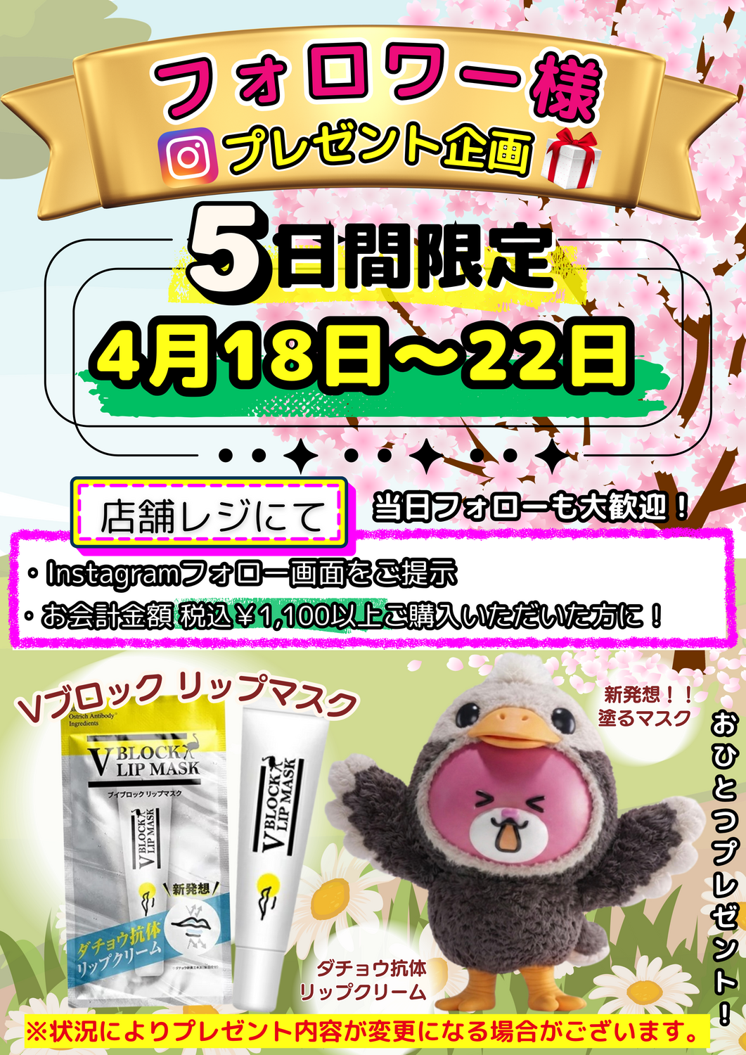 4/18(土)〜4/22(水)の5日間限定 !Instagramフォロワー様プレゼント企画開催🎁✨